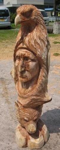 今回は龍神チェンソーカービング倶楽部の練習会でワシ族のインディアン(ネイティブアメリカン)を彫った。前回のフクロウに続いてインディアンシリーズ。 この調子でオオカミ族も彫ろうかな。 ところでこの木、一昨年の12月新月伐採したものだ。2年半た…