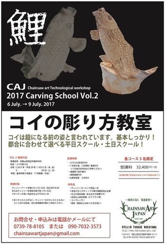 チェンソーアートスクール 2017年度 Vol.2 コイの彫り方教室 御案内 ※当初、ワシの顔の彫り方を予定していましたが、リクエストの多かったコイに変更します。 申込み受付を開始します。受講人数に限定がありますのでお早めにお申し込みください。
