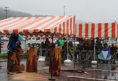 古殿町チェンソーアート文化祭2017 2日目 カービングショウ ①10:00~ ②12:00~ ③14:00~ 2017年(平成29年)10月29日(日) 福島県石川郡古殿町 道の駅「おふくろの駅」 あいにくの雨でしたが多くのお客様にご来場いただきました。 完成した作品たちです。