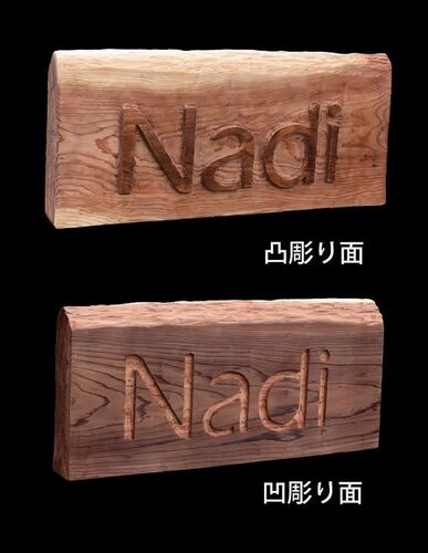 友人を通してご注文いただいたロゴ看板です。 今回は凸彫りと凹彫りを両面に施しました。 どちらでも使用できます。 着色無し 大きさ:80×35×10(cm) 樹種:杉