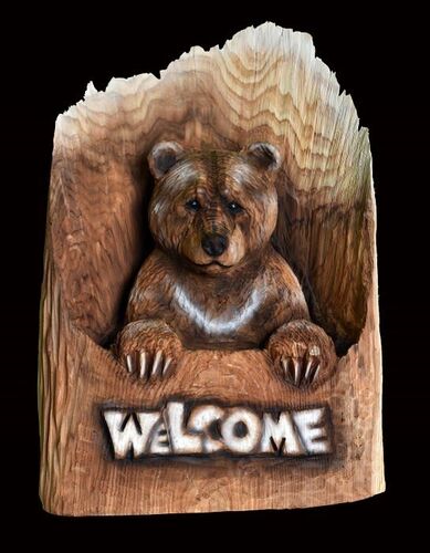 熊の彫刻シリーズ 最新作 「クマさんのウエルカム」 丸太の中に入っているようなデザインです。 彫刻日:2018年(平成30年)9月12,13日(水,木) 樹種:龍神杉 クマの作品集はこちらをクリックしてください。