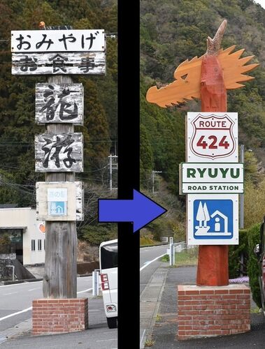 「道の駅 龍游」 和歌山県田辺市龍神村福井にある道の駅である。 そこに立つ高さ6mの木製看板がかなり傷んできたため、フォレストウッド協同組合看板事業部でリメイクして全く新しい木製看板を作ることとなった。 杉の丸太を使用した看板であったため、傷…