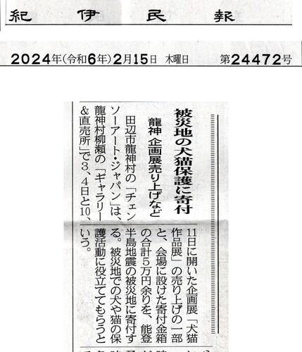 犬猫作品展 能登半島地震被災犬猫寄附金について 有限会社チェンソーアート・ジャパン どらごんワンコの会 寄附金箱に18,672円入っていましたので、売上げ利益から32,180円を足して50,852円を能登半島地震で被災された犬猫救済に寄附させていただきました。…